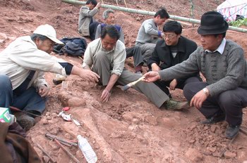 中新網3月2日電 曾經出土過許多恐龍蛋化石、骨化石的浙江省天臺縣,最近邀請有“龍王”美譽的中國科學院古脊椎古人類研究所著名恐龍專家董枝明教授、中國地質科學院資源所礦物巖石學家陳克樵教授首次對恐龍骨化石進行科學的搶救性挖掘。經過近一周的工作,已發現了恐龍脊柱骨、肋骨、尾脊、小的甲片、前后肢等化石。