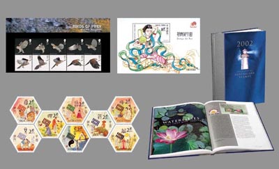 英國皇家郵政發行的“捕食鳥”一套10枚郵票(圖上左)、由澳門郵政發行的“易經/八卦II”小全張(圖上右)和一套8枚郵票(圖下左),以及由澳洲郵政發行的“2002年澳洲郵票冊”(圖下右)。 (香港特區政府網站圖)