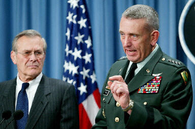 3月5日,在美國(guó)華盛頓五角大樓,美國(guó)國(guó)防部長(zhǎng)拉姆斯菲爾德(左)和美國(guó)中央司令部司令弗蘭克斯出席記者招待會(huì)。弗蘭克斯說,美軍目前已經(jīng)為對(duì)伊拉克采取軍事行動(dòng)作好了準(zhǔn)備。