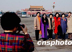 三月八日國際婦女節之日在北京出席全國政協十屆一次會議的政協女委員們,相互在北京天安門廣場合影。作者:賈國榮