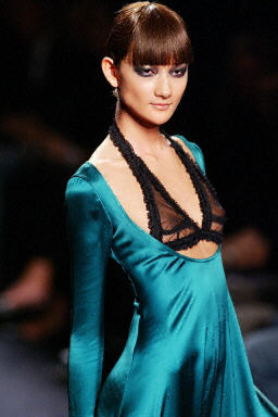 2003年3月10日,在法國(guó)巴黎舉行的2003至2004年秋冬時(shí)裝展上,模特現(xiàn)場(chǎng)展示了Yves Saint Laurent的新款服飾.