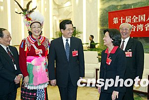 胡錦濤向臺灣代表團的各位代表,并向廣大臺灣同胞致以誠摯的問候。會場上,發(fā)言踴躍,親情融融。胡錦濤認真聽取大家的發(fā)言。他說,中共十三屆四中全會以來,我們堅持“和平統(tǒng)一、一國兩制”的基本方針,應對挑戰(zhàn),排除干擾,大力推動對臺工作,取得了重大成果。國際社會普遍堅持承認一個中國的基本立場,兩岸關系的基本格局和發(fā)展趨勢沒有改變。這是以江澤民為核心的第三代中央領導集體正確決策和堅強領導的結果,是包括臺灣同胞在內(nèi)的全體中華兒女共同努力的結果。