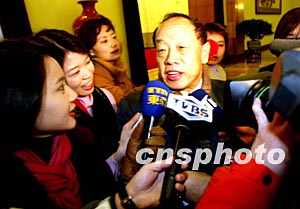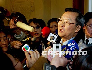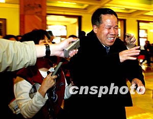 十七日出任外交部部長(zhǎng)的李肇星,被記者圍堵在會(huì)場(chǎng)門口。作者:鄭萍萍