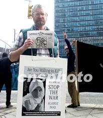 當地時間三月十七日上午,聯合國內伊拉克問題上的外交斗爭正式結束。美、英、西宣布,放棄在安理會上對伊拉克最后通牒議案進行表決的努力。在聯合國總部門前,一名反戰者身掛伊拉克殘疾少女畫像的表語牌,上書:“為抓住薩達姆,你想殺死她嗎”?作者:陳