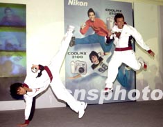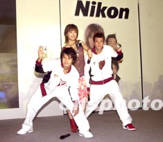 人氣新組合Boy'Z兩名成員關(guān)智斌(Kenny) (左)、張致恒(Steven) 3月17日晚在香港出席Nikon全新相機(jī)新聞發(fā)布會(huì)。出道不久但人氣急升的Boy'Z兩名成員,以充滿活力的高難度動(dòng)作為Nikon展示COOLPIX 2100及COOLPIX 3100數(shù)碼相機(jī)。鄧慶樂(lè) 攝