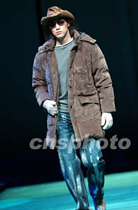 三月二十七日,馬克·華菲03/04秋冬時裝發布會在北京舉行,模特展示一款充滿西部風情的時裝,體現了設計師大膽的想象力。作者:盛佳鵬