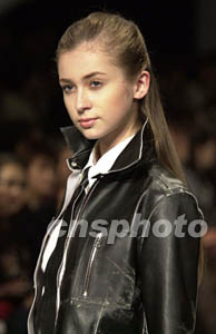 在二00三年東京秋冬時裝展上,日本各路時裝設計師順次登場發表新作。圖為模特28日晚演示著名時裝設計師鳥居由紀的皮革新作。作者:陶光雄