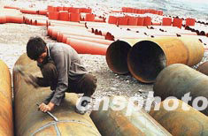 三峽重慶市庫區正抓緊時間對城市污水環境實施治理工程,全市將建19座污水處理廠,日處理污水51萬噸,主要分布在江津、涪陵、長壽、豐都、萬州、云陽、奉節等移民遷建城市。圖為奉節縣正在加工鑄造污水管道。作者:周會