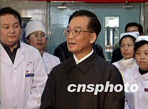 中共中央政治局常委、國務院總理溫家寶十二日下午來到北京佑安醫院,看望參加非典型肺炎防治工作的醫學專家和醫護人員,并向奮戰在非典型肺炎防治工作第一線的廣大醫務人員致以親切慰問。作者:中新社
