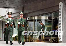 中國銀行業(yè)監(jiān)督管理委員會二十八日正式掛牌。銀監(jiān)會將行使原由中國人民銀行履行的監(jiān)督管理職權(quán)。圖為武警戰(zhàn)士在銀監(jiān)會門前執(zhí)勤。作者:毛建軍