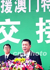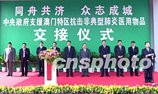 中央政府支援澳門抗擊非典型肺炎醫(yī)用物品交接儀式二十七日在拱北口岸舉行,全國(guó)政協(xié)副主席、港澳辦主任廖暉,澳門特區(qū)行政長(zhǎng)官何厚鏵、中央駐澳聯(lián)絡(luò)辦主任白志健等出席儀式。中新社記者:李剛