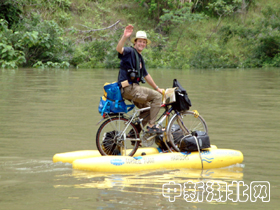 一位外國朋友騎著水上自行車來到神女峰參觀