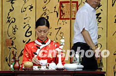 六月十五日,北京一家商場在門口表演茶道,在父親節的周末促銷新到的茶葉品種。中新社記者 盛佳鵬 攝