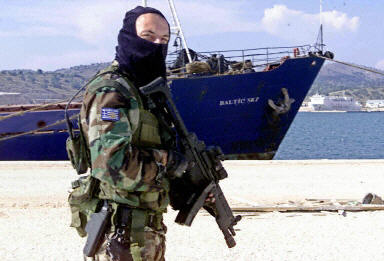 6月23日,一名希臘特種兵在一艘被查獲的輪船附近警戒。希臘特種部隊22日截獲一艘懸掛科摩羅國旗的船只,并在船上查獲了680噸爆炸物。
