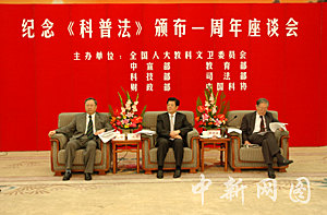 為此,中國全國人大教科文衛委員會、中共中央宣傳部、教育部、科技部、司法部、財政部和中國科協二十九日聯合在北京人民大會堂舉行座談會,紀念這一世界首部科普法規誕生一周年。