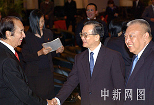 國務院總理溫家寶6月29日在下榻的酒店,會見香港工商界人士時,親切問候邵逸夫。洪少葵 攝