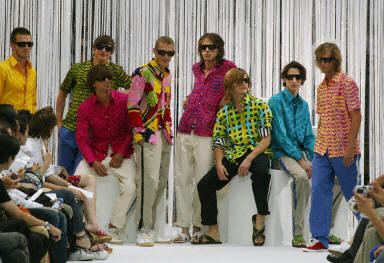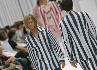 6月29日在法國巴黎舉行了2004春夏流行男裝發布會。圖為模特們展示英國設計師保羅·史密斯的時裝作品。