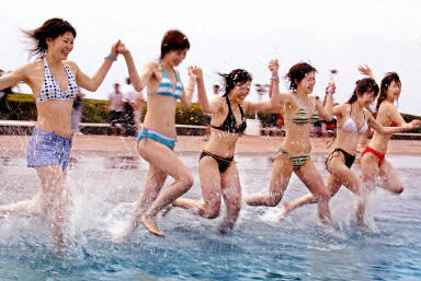 7月5日在東京西部一個小鎮,大約有3,600名游客來此游泳。東京地區的溫度高達30度。圖為穿著性感比基尼的日本女孩高興的奔向游泳池。