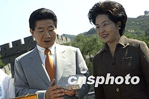 盧武鉉與夫人登上北京八達(dá)嶺長城,體驗(yàn)“不到長城非好漢”的美妙感受。中新社記者:毛建軍