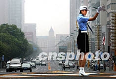 通過公開招聘的二十五名腳蹬白靴的女警花,七月二十二日起在大連繁華路段執勤,為當日拉開序幕的亞歐經濟部長會議開道。中新社記者:鄭萍萍