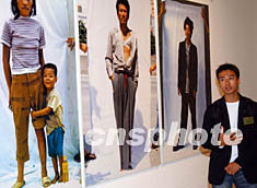 “香港藝術雙年展2003”,七月二十二日在香港藝術館舉行新聞發布會,此次展覽共收到1500多件參賽作品,最后評選出十個優秀獎。圖為胡健一向賓客介紹他的攝影作品《游人》。中新社記者:錢興強