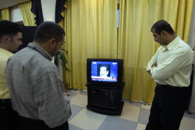 圖為觀看電視臺(tái)播放薩達(dá)姆哀悼兩個(gè)兒子錄音帶的伊拉克人。