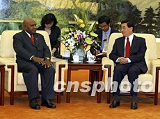 中國(guó)國(guó)家主席胡錦濤三十日在北京會(huì)見(jiàn)巴布亞新幾內(nèi)亞總督阿托帕爾。中新社記者:滿會(huì)喬