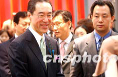 圖:唐英年與江蘇省副省長梁寶華為“江蘇·香港周”開幕剪彩 (2002-12-09 19:23:08)