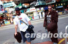 8月3日,外國游客打扮成“大猩猩”在香港時代廣場一帶消遣玩樂,引來不少途人圍觀。中新社記者:洪少葵
