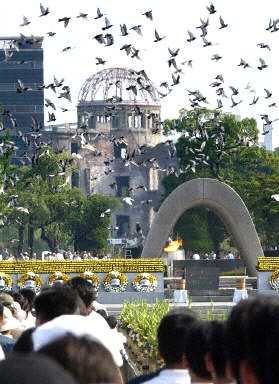 當?shù)貢r間8月6日,日本廣島正在為美國原子彈轟炸廣島58周年而舉行紀念活動。圖為在廣島的和平紀念公園,一群和平鴿飛向天空。
