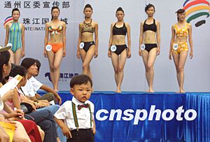 百余名泳裝佳麗競相登場。一名觀眾席上的小帥哥躍躍欲試當(dāng)眾擺出瀟灑姿勢。中新社記者:廖文靜