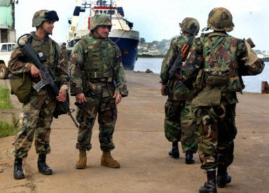 圖為美國海軍陸戰隊員在蒙羅維亞港口做安全維護工作。