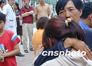圖為被埋地下的民工家屬在焦急地等待著親人的消息。作者:寧秀英