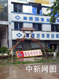 受其影響,海南省會海口市市區出現一年來最大風災,一家燒烤園的招牌倒了。