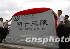 中新社北京八月二十八日電(記者吳慶才)今天,北京有關部門為上月被列入世界文化遺產名錄的明十三陵正式“樹碑立傳”,一塊坐落于明十三陵門戶——大紅門前的世界文化遺產標志牌正式落成,并將成為十三陵特區新的標志性景觀。