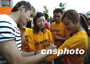 西門子移動電話公司三十日為中國女子足球隊9月出征世界杯比賽舉行“萬人簽名為中國女足加油”活動。中國男足隊員祁宏為“西門子小姐”邀簽名留念。中新社記者:趙振清