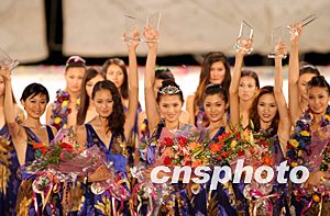 九月十四日晚,2003年新絲路中國(guó)模特大賽決賽在海南三亞天涯海角舉行,肖青(左三)獲得本次大賽冠軍,谷雨(左二)、姚瑤(左四)獲得大賽亞軍,張曉雯(右一)、羅君(右二)以及來(lái)自臺(tái)灣的選手吳育臻(左一)獲得本次大賽季軍。中新社記者:盛佳鵬