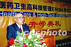 中山大學醫藥衛生高科技管理EMBA學位項目的開學典禮二十六日在廣州中山大學嶺南學院舉行,這是中國第一個獲準頒發醫療服務方向管理教育(EMBA)學位的項目。圖為嶺南(大學)學院董事會名譽主席伍沾德先生在典禮上致詞。作者:羅仰明