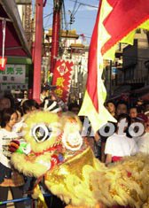 為慶祝祖國國慶五十四周年,著名的日本橫濱中華街十月一日舉行了一系列的慶祝活動,其中街頭進行的采青獅子舞表演,吸引了眾多游客。作者:王健