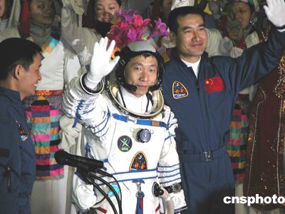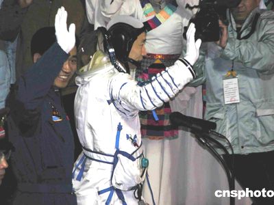 中國酒泉衛(wèi)星發(fā)射中心為執(zhí)行首次載人航天飛行任務(wù)的航天員楊利偉舉行出征儀式,圖為楊利偉向前來送行的人們揮手致意。中新社記者 孫自法 攝