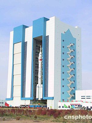 被稱為“亞洲第一門”的酒泉衛(wèi)星發(fā)射中心載人航天發(fā)射場總裝測試廠房大門開啟后,“神舟”五號(hào)載人飛船船箭塔組合體開始向發(fā)射塔架垂直轉(zhuǎn)運(yùn)。中新社記者孫自法攝