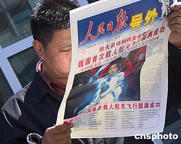 相關(guān)報道:香港輿論聚焦“神舟”五號征空成功市民紛紛搶閱 (2003-10-16 15:02:58)