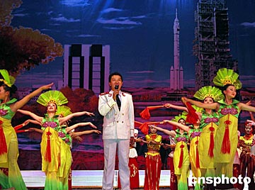 十月十六日晚,中國酒泉衛(wèi)星發(fā)射中心舉行專題晚會,慶祝中國首次載人飛行圓滿成功。中心的科技人員和部隊官兵載歌載舞,歡慶“神舟”五號飛船成功發(fā)射和中國首位航天員順利返回。圖為歌舞表演《盛世中華》。中新社記者:孫自法