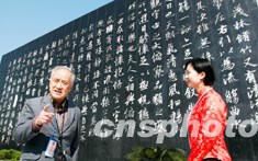新整修后的王羲之故居矗立一座高大的字碑,被尊稱為天下第一行書的《蘭亭序》篆刻其上,一位參加書圣文化藝術節的天津書法愛好者,激動地向參觀者訴說自己對王羲之書法的崇拜。作者:王麗南