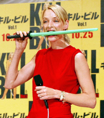 好萊塢著名影星烏瑪·瑟曼19日在日本東京出席由她主演的最新動作片《殺死比爾》的新聞發(fā)布會。