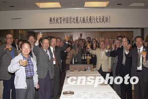 日本東京地區華僑21日在東京華僑總會舉行慶祝會,慶賀祖國首次載人航天大獲成功。中新社記者:王健