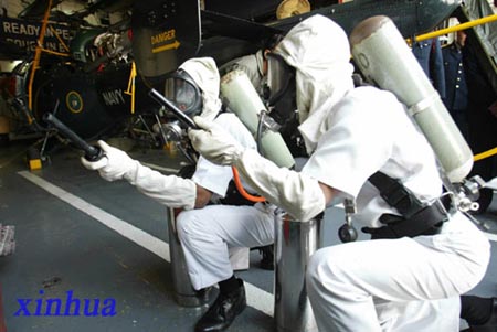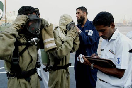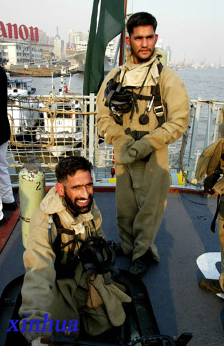 10月21日,巴基斯坦海軍“巴布爾”號驅逐艦損管隊員在為演習作準備。新華社記者 查春明 攝