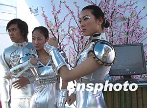 首屆中國國際網絡文化博覽會十月二十三日在北京中華世紀壇開幕,近百家網絡知名企業和網絡媒體參展,上海一家網絡游戲運營公司的模特身著《破碎銀河系》網絡游戲中角色的服裝在展臺前表演。中新社記者:張勤