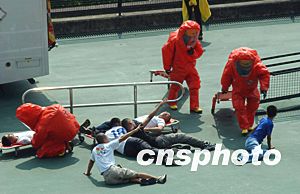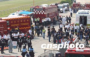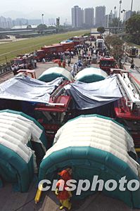 來自保安局、消防處、醫(yī)院管理局、醫(yī)療輔助隊(duì)、民安隊(duì)、天文臺、衛(wèi)生署和賽馬會共1300多人參與此次演習(xí)。中新社記者:洪少葵