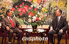 國務院僑辦副主任趙陽(圖右)24日在重慶會見菲律賓著名華人實業家陳永栽,趙陽表示,陳永栽先生投資設立的新聯商業銀行重慶分行將對重慶乃至西部地區經濟發展起積極作用。作者:鄒輝